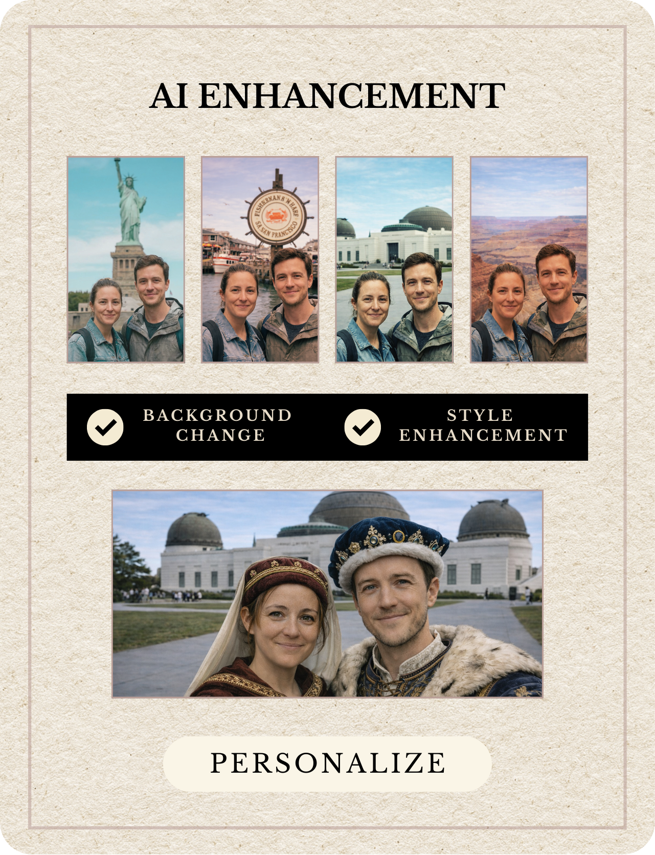 Transforms guests into characters inspired by the location — from sailors to explorers — while keeping their identity intact.