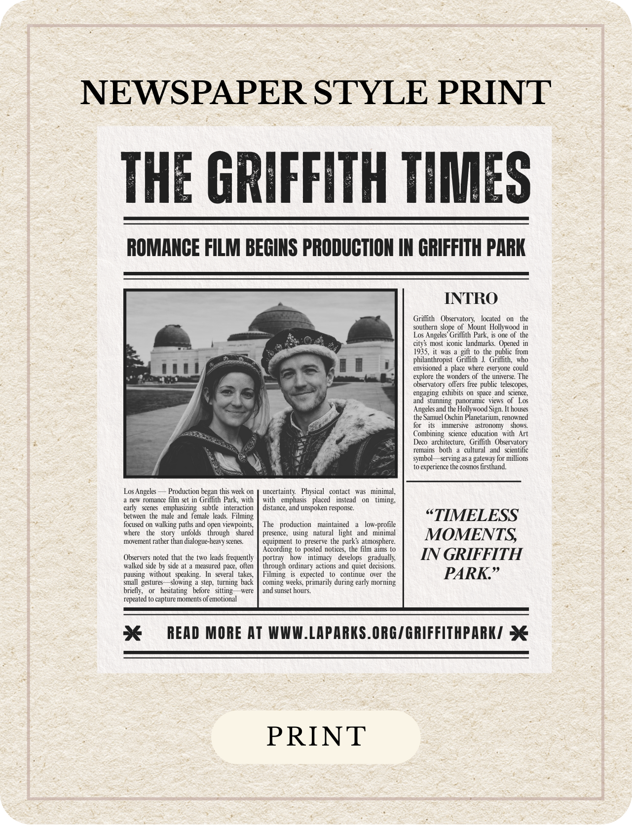 The newspaper layout transforms photos into keepsakes that feel timeless and editorial.